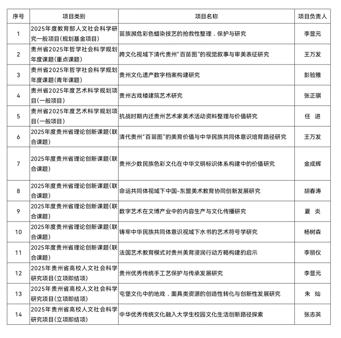 截至2025年12月10日,我院共获批14项2025年度人文社会科学研究项目,包括2025年度教育部人文社会科学研究一般项目1项,贵州省2025年哲学社会科学规划年度课题2项,贵州省2025年度艺术科学规划项目2项,2025年度贵州省理论创新课题6项,2025年贵州省高校人文社会科学研究项目3项。立项数创历史新高,充分显示了我院聚焦学科前沿、立足本土实践的学术定位与发展路径。