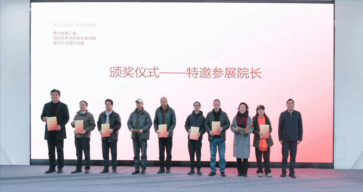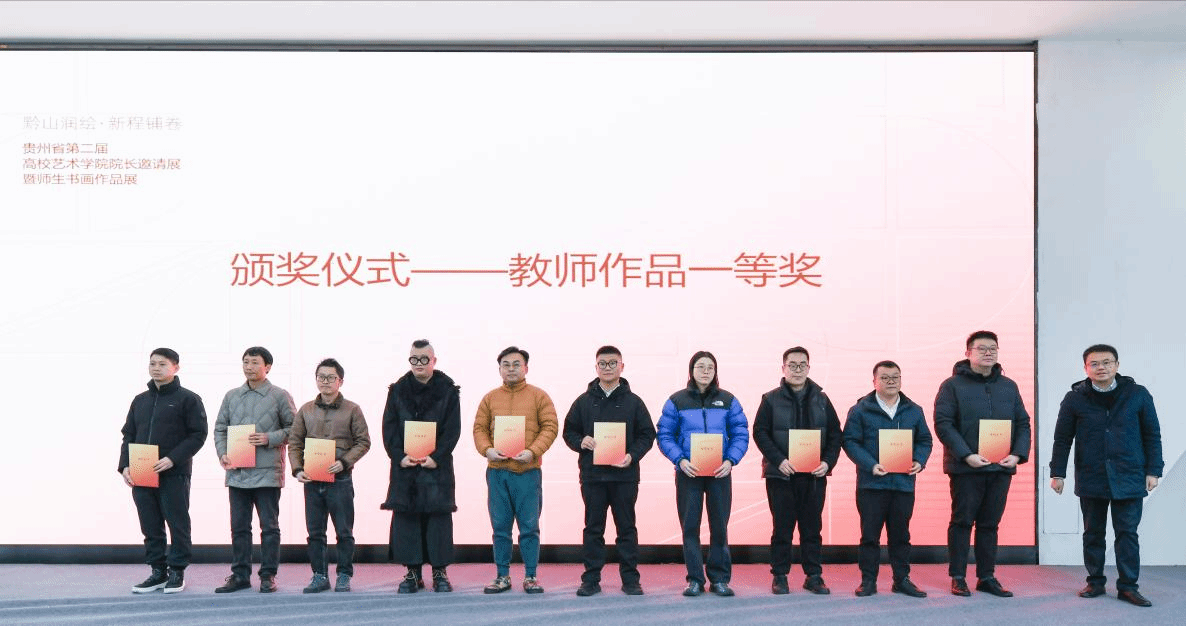 开幕式现场进行了获奖证书颁发和作品捐赠仪式。曾洪波处长、冯海涛副校长、邱国鹏副厅长分别为学生组获奖代表、教师组获奖代表、特邀参展院长代表颁发证书。贵州师范大学美术学院朱世伟教授的油画作品《正午》、国腾飞副教授书法作品《行书陆放翁七律》捐赠给贵州美术馆收藏,贵州美术馆馆长潘闻丞接受捐赠并颁发收藏证书。