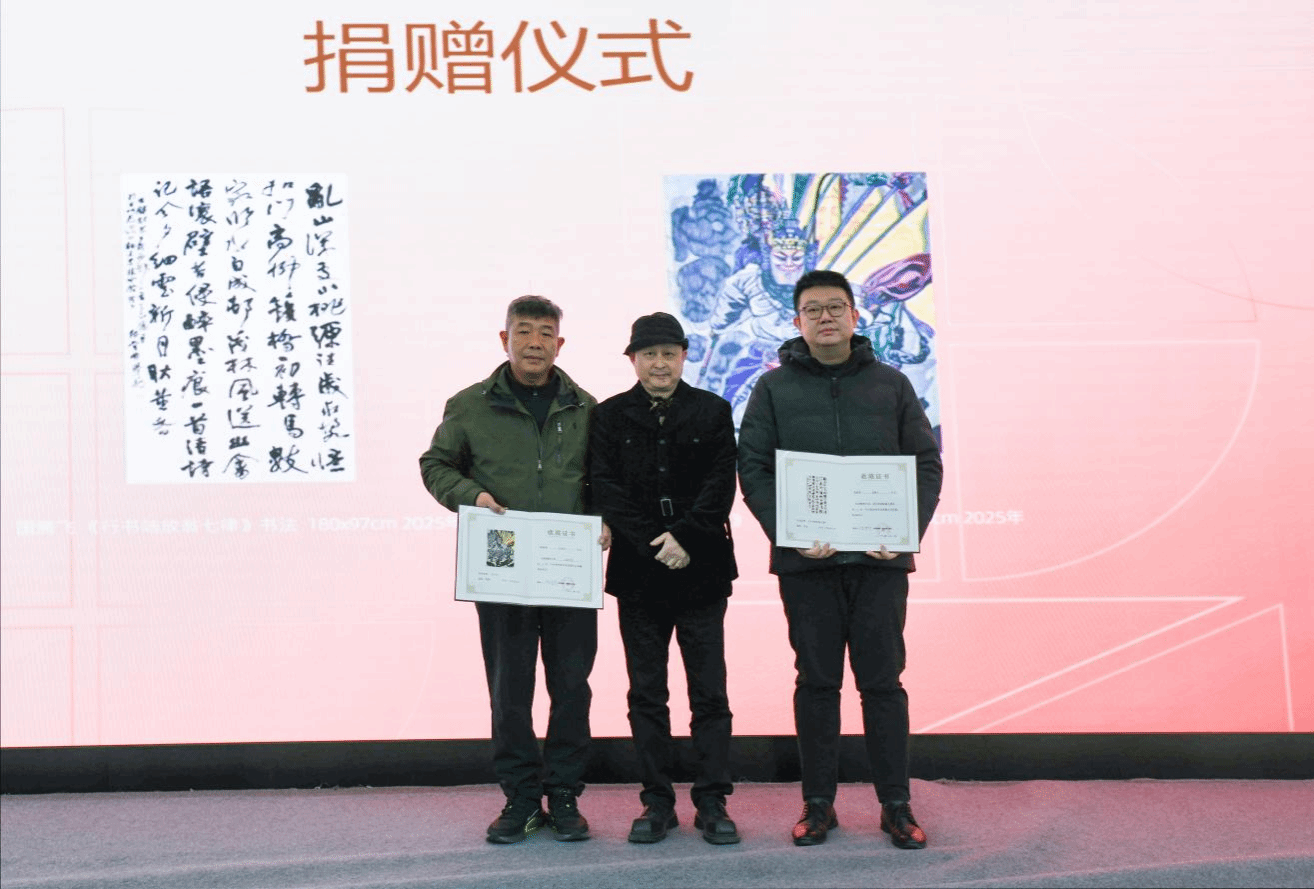 贵州美术馆馆长潘闻丞为朱世伟、国腾飞颁发收藏证书