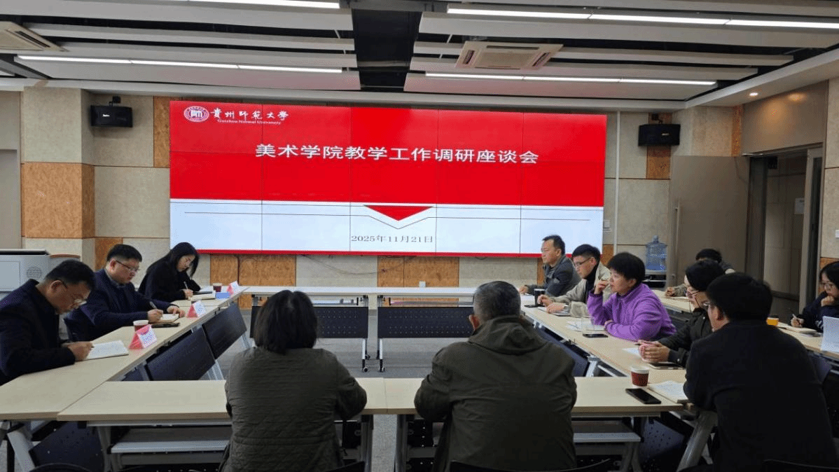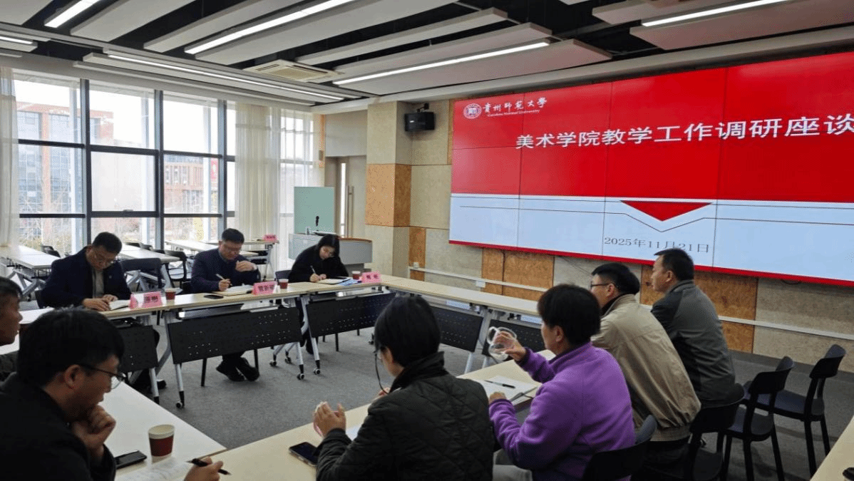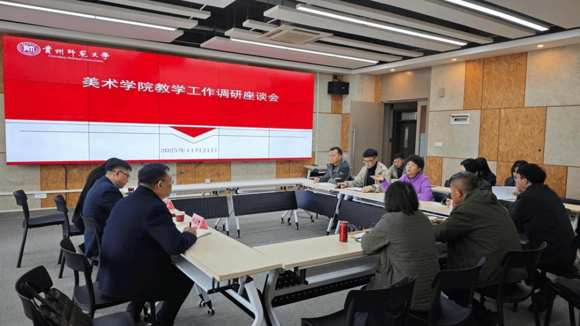 2025年11月21日,贵州师范大学副校长管新福、教务处处长冉源懋、教务处教学研究科科长梅畅一行到美术学院,开展了美术学院教学工作调研座谈会。美术学院党政班子、各系主任、教学管理科、学院办公室相关负责人参加了座谈会。座谈会围绕教风学风建设、学科专业发展、教学成果培育、教改项目申报、教学设施维护、公共美育实施等方面进行了深入交流。美术学院汇报了学风建设、学业提升、美育课程、学科建设方面的主要措施和成效,各位领导对美术学院的教学工作给予了充分肯定,并对美术学院的高质量发展提出了具体建议与要求。