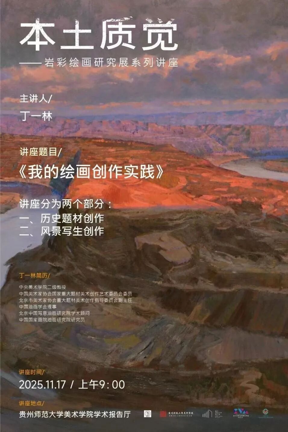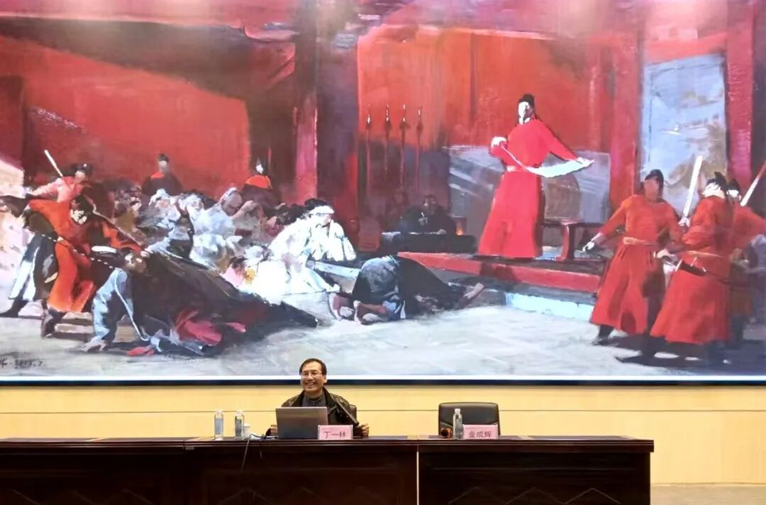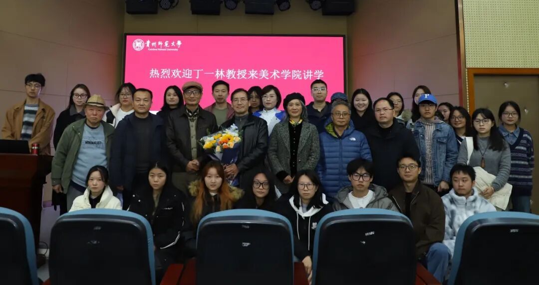 11月17日,中央美术学院教授、中国美术家协会国家重大题材美术创作艺术委员会委员、中国油画学会理事丁一林先生莅临贵州师范大学,上午为美术学院师生作了题为“我的绘画创作实践”的学术报告,下午在研究生院主讲了“浅析历史画主题的再创造与美育启示”的专题讲座。两场讲座均由美术学院副院长金成辉主持。美术学院本科生、研究生、专业教师,以及全校研究生代表300余人积极参与了本次学术活动。