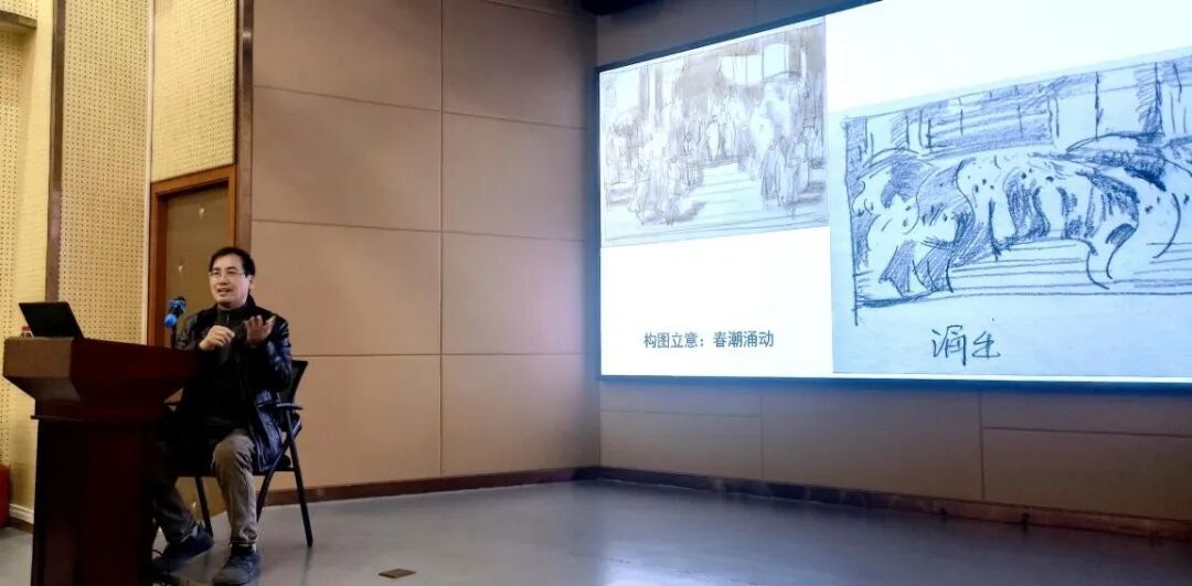 丁一林教授结合国家重大历史题材美术创作的丰富经历,从主题性绘画创作的主题内容、形象元素、形式转化三个维度,解析了历史题材绘画作品的叙事逻辑和生成机制,展现了重大历史题材创作中“史”与“艺”的平衡之道。又从即兴生成、随机应变、跨越联想三个方面,分析了油画风景写生的构图立意和表现技巧,将写生现场的视觉感受转化为绘画语言的表达方式。为我院师生呈现了一场历史、文化、艺术交融的视觉盛宴。